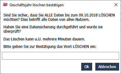 Die Funktion “Geschäftsjahr löschen” löscht unwiederbringlich Daten aus dem Programm. Eine Wiederherstellung ist nicht möglich! Eine falsche Handhabung kann zum Verlust großer Datenmengen führen. Führen Sie bitte unbedingt vorher eine Datensicherung durch. Prüfen Sie anschließend, ob die von Ihnen gewünschten Daten gelöscht wurden. Vergewissern Sie sich auch, ob Sie im korrekten Datenmandanten arbeiten, falls Sie parallel mehrere Datenbestände nutzen. Holen Sie sich auch unbedingt die Erlaubnis Ihrer Vorgesetzen ein, bervor Sie ein Geschäftsjahr löschen.
