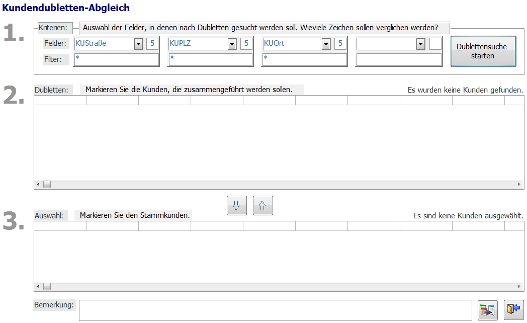 Diese drei Bereiche sind auf der Maske ebenfalls durchnummeriert. Für die Suche nach Dubletten können maximal vier Felder angegeben werden, die verglichen werden sollen (nicht alle vier Felder müssen auch genutzt werden).
