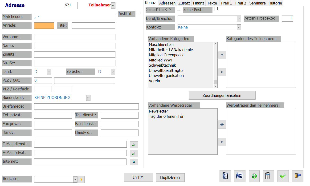 Für eine Adresse können im SeminarManager verschiedene Kennzeichen vergeben werden. Pro Adresse können unter „Kennz“ beliebig viele Kategorien, Werbeträger und Zuordnungen ausgewählt werden. Der Reiter „Kennz“ ist direkt sichtbar, wenn eine Adresse geöffnet wird. Diese Angaben sollen eine Adresse eindeutig kategorisieren und Ihnen für Auswertungen oder Werbeaktionen helfen.