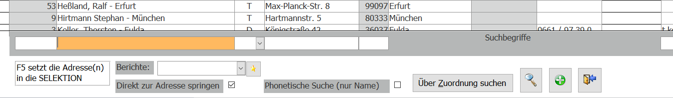 Per Doppelklick können Sie nun in die gesuchte Adresse springen oder mit den Schaltflächen für die Selektion die Adressen in der Selektion weiter bearbeiten.