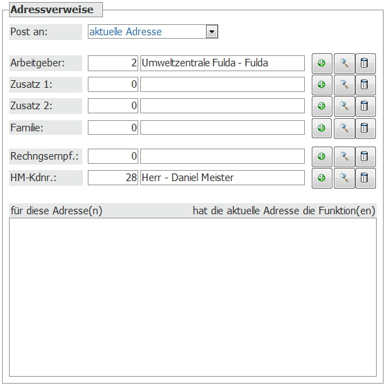 Es stehen insgesamt sechs Adressverknüpfungen zur Verfügung, wobei die letzte Verknüpfung „HM-Kdnr.“ i. d. R. automatisch vorgenommen wird. Am Ende jeder Zeile stehen drei Schalter zur Verfügung: