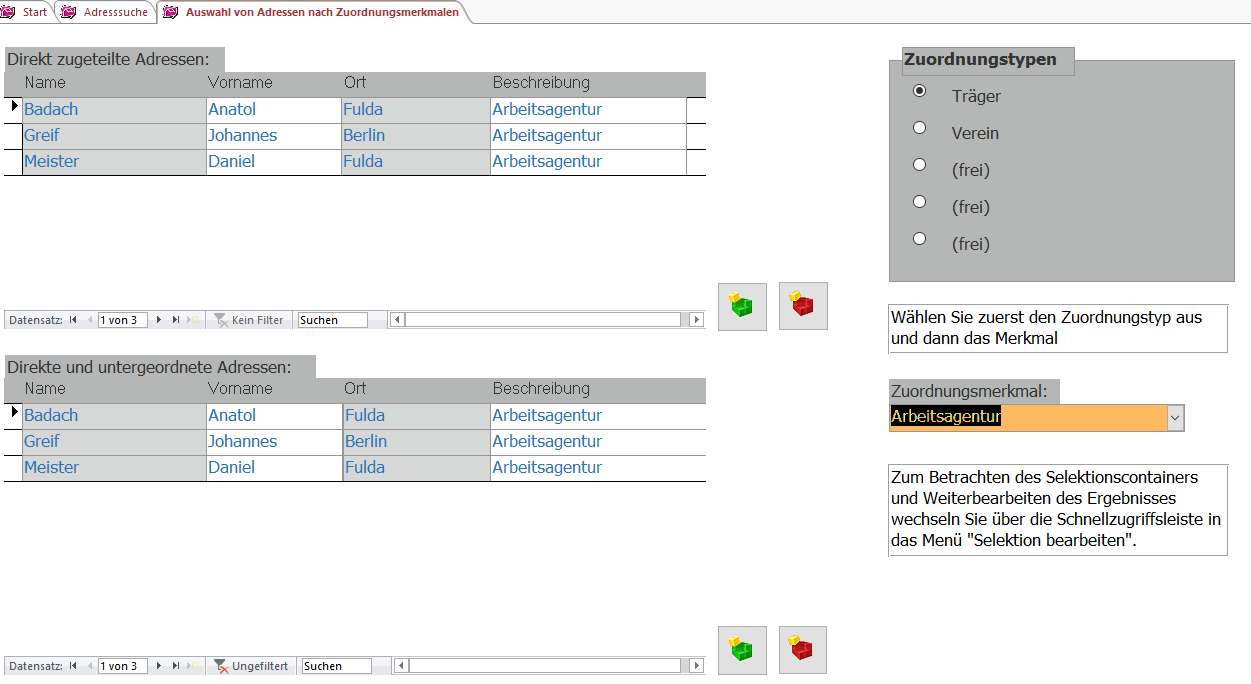Wählen Sie oben rechts zuerst den Zuordnungstyp nach dem Sie suchen möchten. Danach können Sie darunter bei den Zuordnungsmerkmalen das gesuchte Merkmal auswählen. Auf der linken Seite der Maske erscheinen dann sofort die Ergebnisse der Suche. In der oberen Hälfte werden alle Adressen angezeigt, die genau das ausgewählte Merkmal zugeteilt haben. Auf der unteren Seite werden alle Adressen angezeigt, die entweder das ausgewählte Merkmal besitzen oder ein Untermerkmal davon.