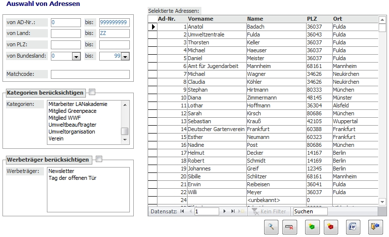 Sie können die Selektion mit beliebigen Adressen füllen. So sollen z. B. alle Adressen selektiert werden, die in einem bestimmten Zeitraum an einem Seminar teilgenommen haben. Oder es werden alle Adressen benötigt, die eine bestimmte Adresskategorie haben. Die Selektion ermöglicht Ihnen, die verschiedenen Filter flexibel anzuwenden und zu kombinieren.