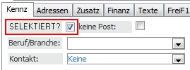 Öffnen Sie eine Adresse im SeminarManager und setzen Sie rechts oben das Häkchen bei „selektiert“, um sie in die Selektion aufzunehmen. Die Adresse kann auch auf der Seite „Adresssuche“ mit einem Klick markiert und mit drücken der Taste „F5“ in die Selektion gestellt werden. Es können auch mehrere Adressen markiert werden.