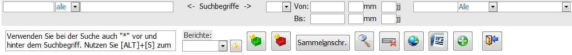 Sie finden die beiden Schalter auch auf der Maske „Seminarsuche“. Wenn die Teilnehmer mehrerer Seminare in die Selektion gestellt werden sollen, können diese Schalter genutzt werden. Suchen Sie über die Maske „Seminarsuche“ zuerst die Seminare heraus, deren Teilnehmer in die Selektion gestellt werden sollen (z. B. alle Teilnehmer der Seminare letzten Jahres; nähere Informationen zur Auswahl von Seminaren finden Sie im Abschnitt „Seminarauswertungen“ dieser Anleitung). Klicken Sie dann auf den grünen Container-Schalter und wählen Sie den Status aus, den die Teilnehmer haben sollen.