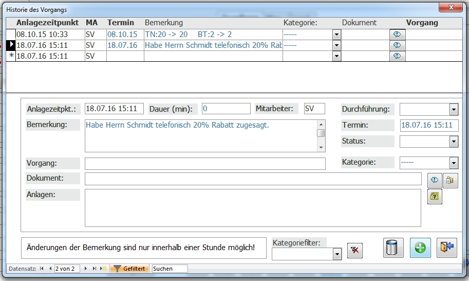 Die Historie lässt sich nur dann effektiv nutzen, wenn sie von allen Mitarbeitern (die mit dem Programm arbeiten) gepflegt wird. Es sollte zu allen wichtigen Kundenkontakten eine kurze Notiz in der Historie gemacht werden. Andernfalls kann die Historie zu einem Vorgang nicht vollständig sein.