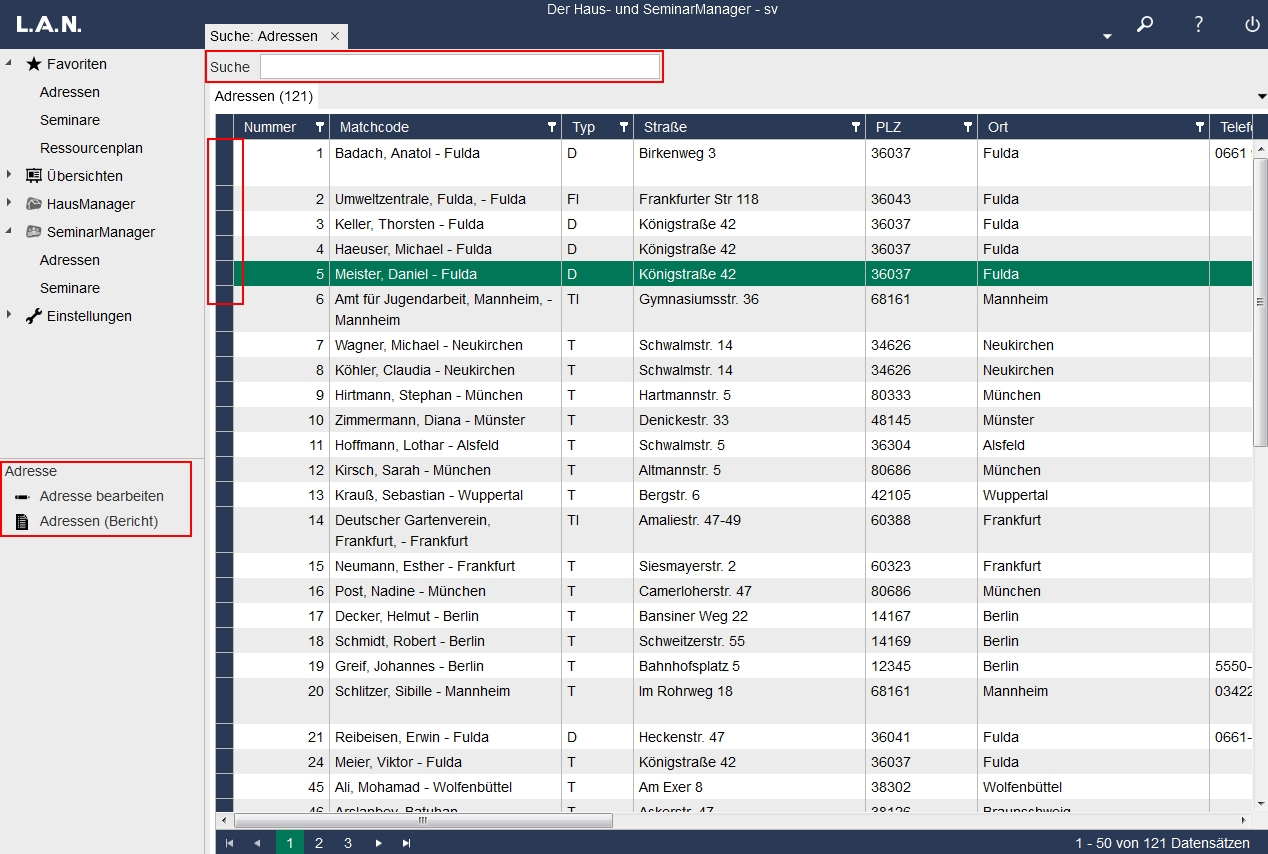 Unter „SeminarManager“ kann mit Klick auf „Adressen“ auf den Adressstamm zugegriffen werden. Es öffnet sich zunächst eine Adressliste mit Suchfunktion.
