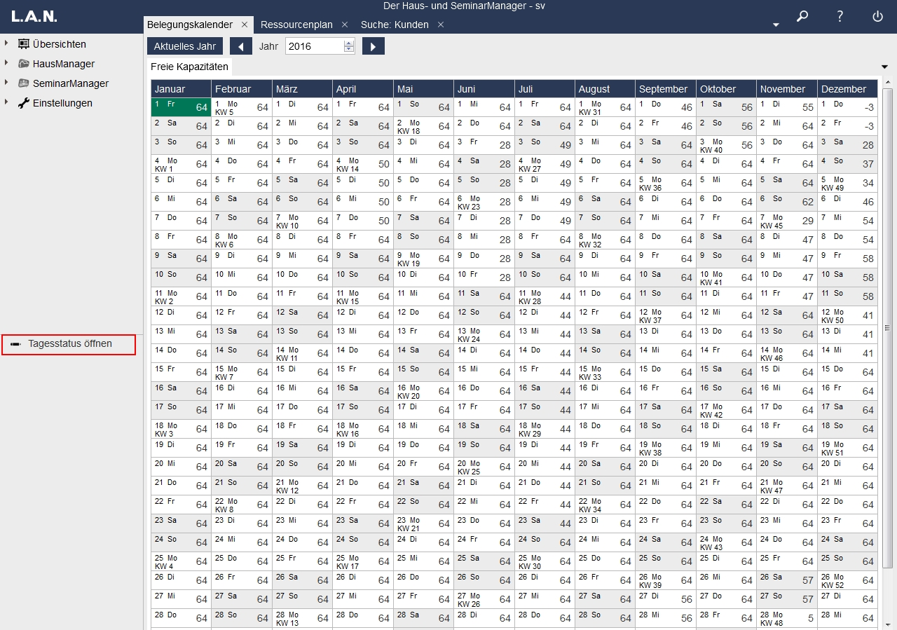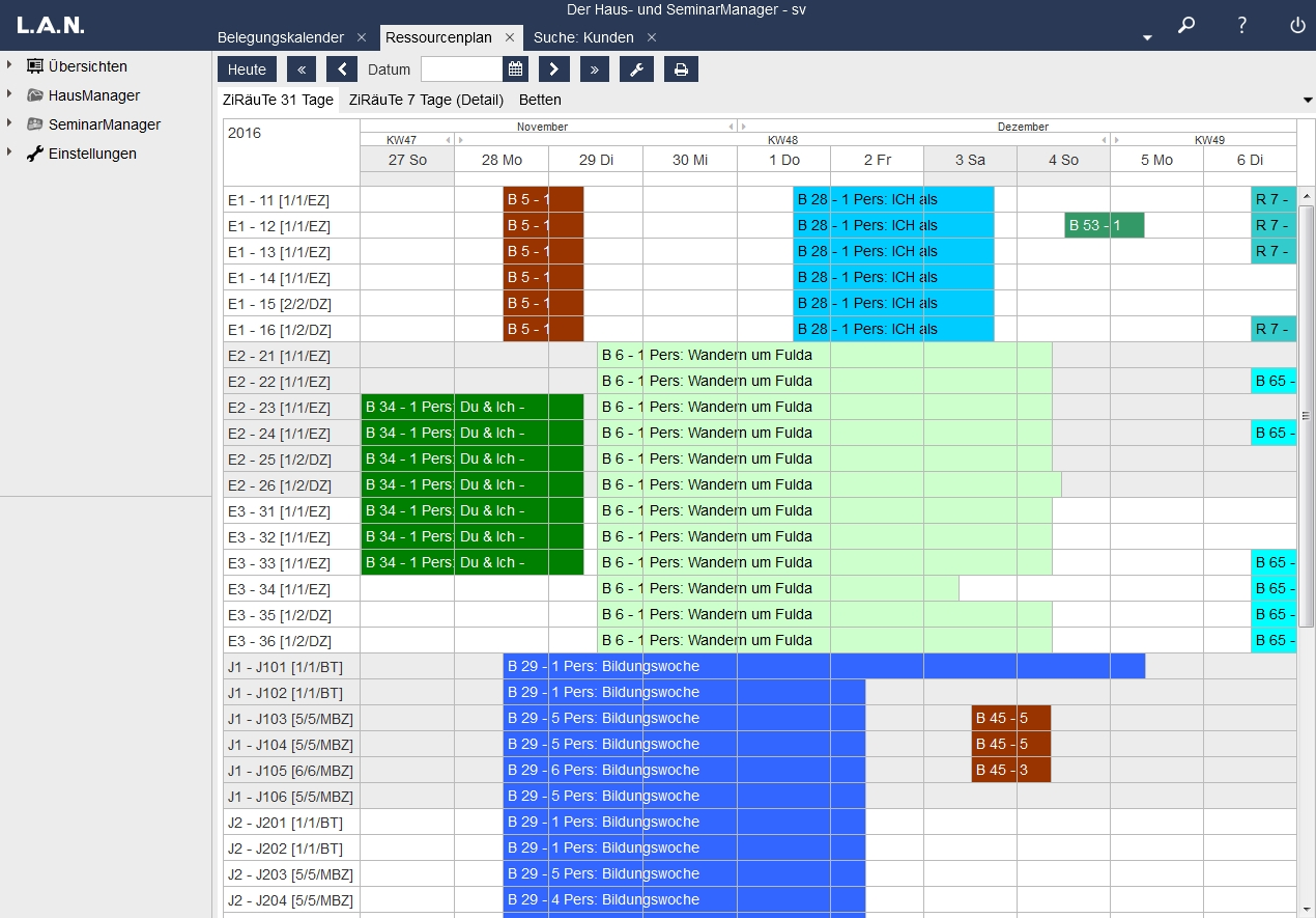 Unter „Übersichten“ sind im Menü die Kalender „Belegungskalender“, „Freie Kapazitäten“, „Tagesstatus“ und „Ressourcenplan“ zu finden. Im Bereich „HausManager“ können Sie auf Ihren Kundenstamm mit Betreuern und Belegungen zugreifen und im Bereich „SeminarManager“ auf den Adressstamm und die Seminare.
