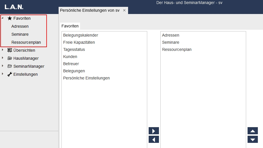 Die Favoriten im Webclient funktioniert ähnlich wie der Schnellstart im Haus- und SeminarManager. Wählen Sie die Menüpunkte aus, die Sie besonders häufig benötigen, um ein eigenes Favoriten-Menü zu erstellen. Die Einstellungen werden für Ihre Anmeldung gespeichert. Somit kann jeder Benutzer eigene Favoriten einstellen.