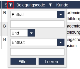 Beispiel: Sie möchten auf der Maske „Tagesstatus“ nur gebuchte Belegungen sehen. Klicken Sie dazu in der Spalte „S“ auf den Filter und geben Sie den Filter „Enthält“ > „B“ ein. Ein Klick auf den Schalter „Filtern“ aktualisiert die Ansicht. Um den Filter zu löschen, können Sie erneut auf das Filter-Symbol und dann auf den Schalter „Leeren“ klicken.