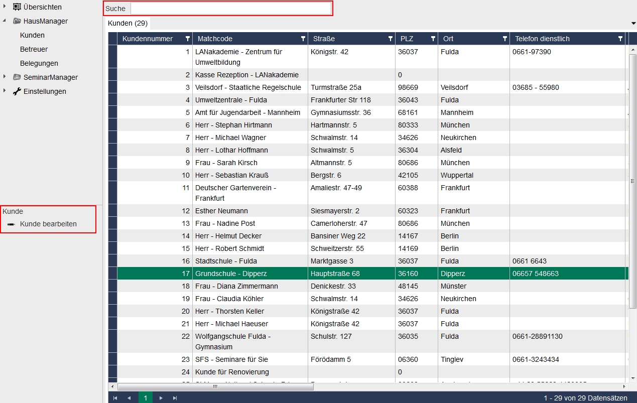 Um alle Informationen zu einem Kunden zu sehen, markieren Sie die Zeile und klicken im linken Bereich auf „Kunde bearbeiten“. Alternativ können Sie wie im HausManager zu Beginn der Zeile doppelklicken, um den Datensatz zu öffnen.