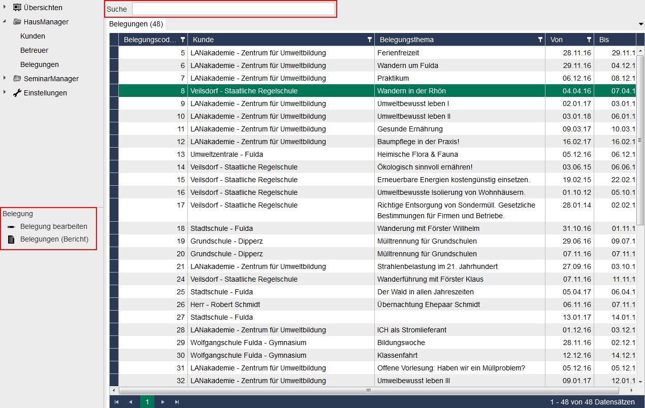 Sie können alle Informationen einer Belegung sehen, indem Sie die Zeile markieren und im linken Bereich auf „Belegung bearbeiten“ klicken. Alternativ können Sie wie im HausManager zu Beginn der Zeile doppelklicken, um den Datensatz zu öffnen.