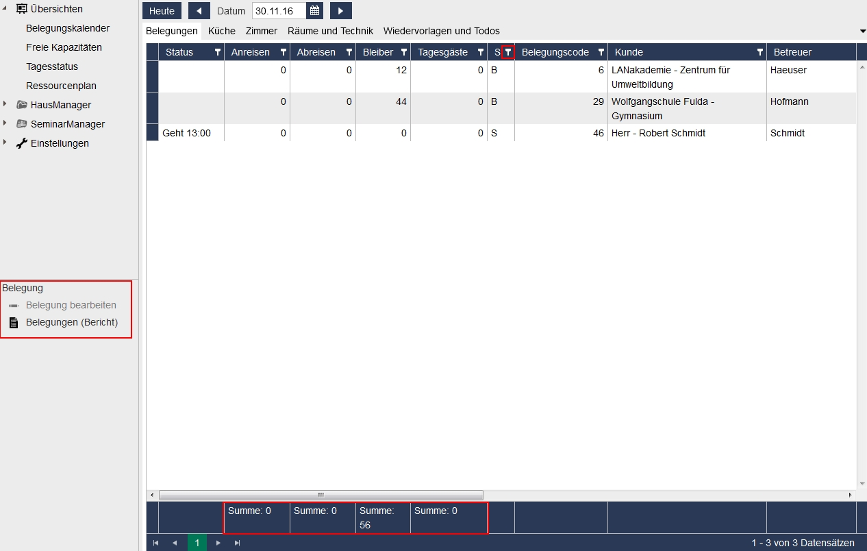 Sie finden Unterhalb der Liste eine Fußzeile, in der die Summen verschiedener Spalten berechnet werden. Die Liste lässt sich in ALLEN Spalten auf verschiedene Kriterien filtern. Möchten Sie bspw. nur gebuchte Belegungen angezeigt bekommen, so stellen Sie den Filter in der Spalte „Status“ auf „B“. Wie das genau funktioniert, erfahren Sie im Abschnitt „Filterfunktion“.