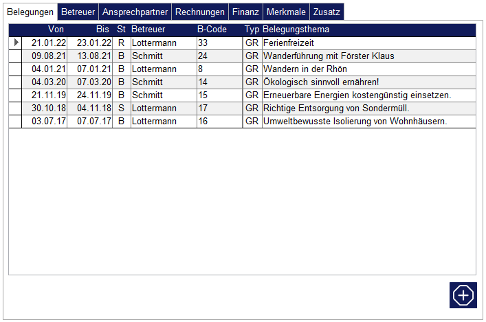 Jeder Kunde, der im HausManager angelegt wurde, kann beliebig viele Belegungen haben. Als „Belegung“ ist zunächst jede Art Aufenthalt in Ihrem Haus zu verstehen. Es können aber auch externe Veranstaltungen als Belegung angelegt werden, die nicht in Ihrem Haus stattfinden, aber von Ihnen verwaltet werden.