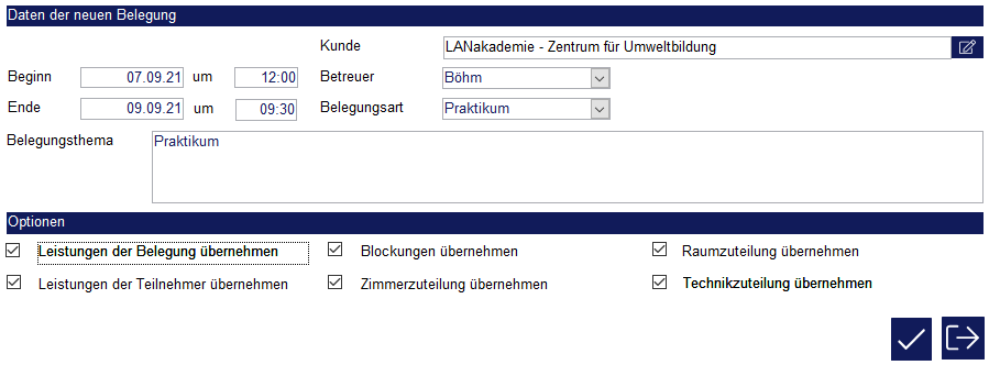 Geben Sie auf der sich öffnenden Maske unter „Daten der NEUEN Belegung“ einfach einen neuen Zeitraum ein und wählen Sie unter „Optionen“ aus, welche Daten der Belegungen für die Kopie übernommen werden sollen. Mit einem Klick auf das Häkchen wird eine neue Belegung angelegt.