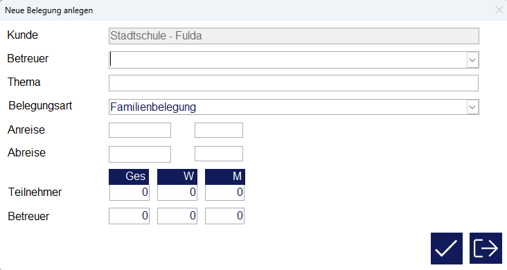 Je Belegung kann nur EIN Betreuer namentlich erfasst werden. Mehrere Betreuer/Teilnehmer lassen sich über das Belegungsteilnehmermodul namentlich hinterlegen.