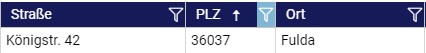 Wenn nach einer bestimmten Dublette gesucht werden soll, so geben Sie den Inhalt des Feldes unter „Filter“ ein. Wenn bei „KUPLZ“ z. B. der Wert „36037“ eingegeben wird, so zeigt der HausManager nur die Kunden mit gleicher Anschrift an, welche die Postleitzahl 36037 haben.