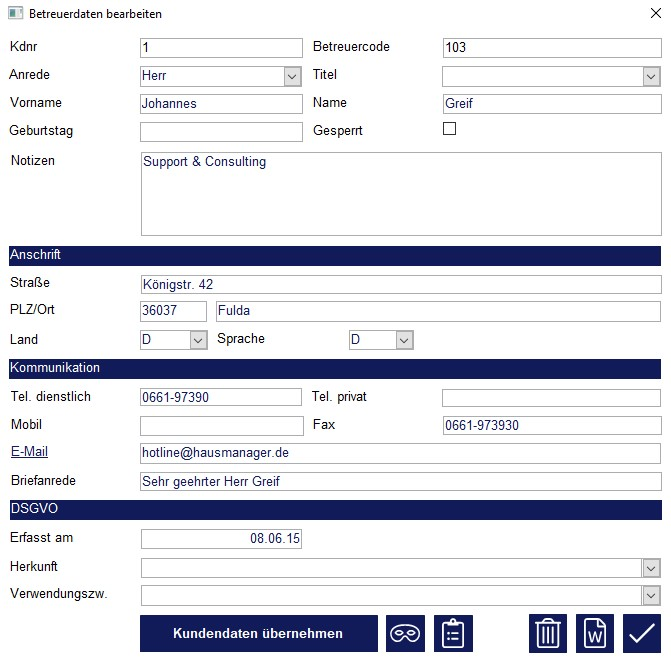 Mit einem Klick auf den Schalter „Kundendaten übernehmen“ werden die Daten, die Sie bei dem Kunden bereits eingegeben haben (Straße, PLZ, Ort …), auf den Betreuer übernommen.