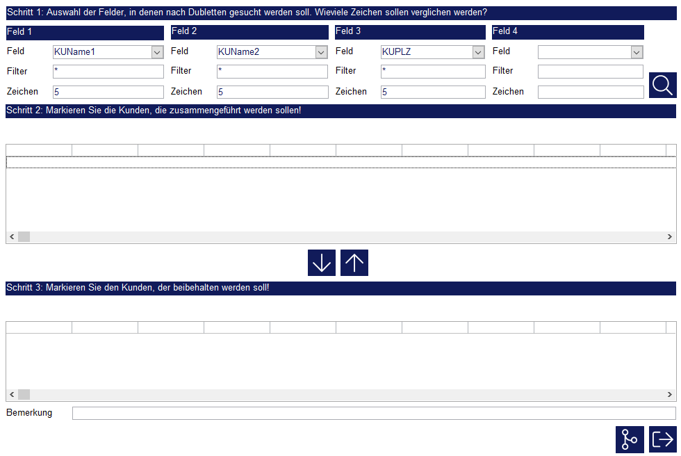 Diese drei Bereiche sind auf der Maske ebenfalls durchnummeriert. Für die Suche nach Dubletten können maximal vier Felder angegeben werden, die verglichen werden sollen (nicht alle vier Felder müssen auch genutzt werden).