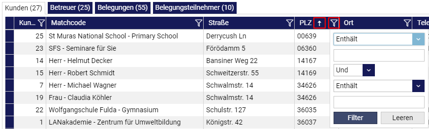 Durch einen Klick auf die Schaltfläche „Filter“ wird dieser angewendet. Durch einen Klick auf „Leeren“ werden die Filterkriterien entfernt und direkt auf die Suche angewandt. Sie können beliebig viele Spalten filtern. Auf diese Weise können beispielsweise alle Kunden aus dem PLZ-Bereich 30000 bis 40000 mit dem Namen „Müller“ gesucht werden. Sollten Sie einen bestimmten Datensatz (Kunde, Betreuer, Belegung oder Belegungsteilnehmer) nicht finden können, vergewissern Sie sich, ob noch ein Filter für eine Spalte gesetzt ist. Dies erkennen Sie an einem türkis hinterlegten Filtersymbol.