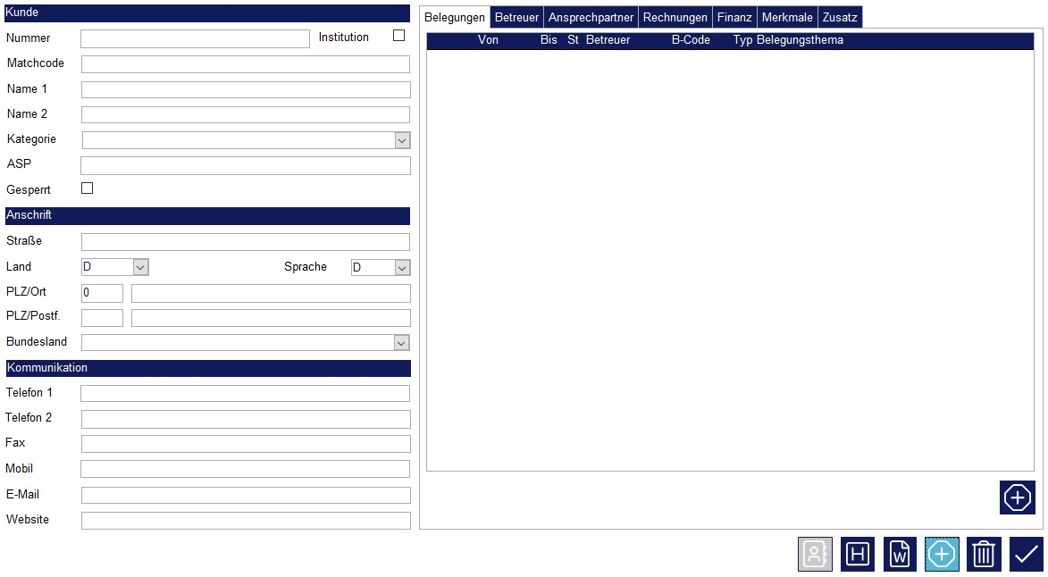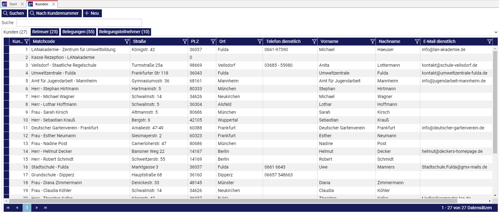 In diesem Fall wurden anhand des Suchbegriffs „Akademie“ 27 Kundendatensätze, 25 Betreuer, 55 Belegungen und 10 Belegungsteilnehmer gefunden. Für die Bereiche Kunden, Betreuer, Belegungen und Belegungsteilnehmer werden anhand des Suchbegriffs jeweils alle Felder durchsucht. Die Bemerkung „Nummer Akademie“ im Feld „Telefon dienstlich“ würde beispielsweise auch zu einem Treffer führen und somit den dazugehörigen Kundendatensatz anzeigen. Zusätzlich würden natürlich auch die BetreuerInnen und Belegungen dieses Kunden auf den zugehörigen Karteireitern angezeigt werden.