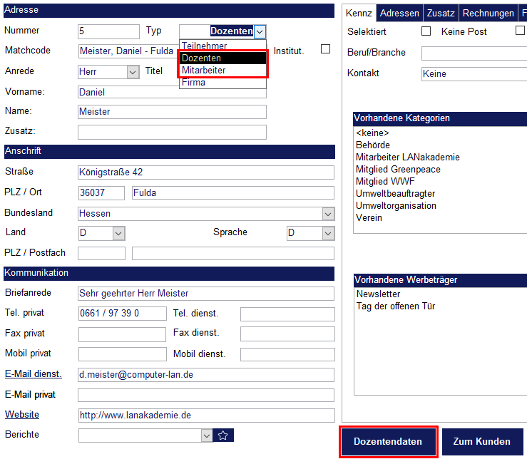 Danach erscheint am unteren Bildschirmrand ein Schalter namens „Dozentendaten“. Bitte klicken Sie auf diesen Schalter, um für die Adresse einen Dozentendatensatz anzulegen.
