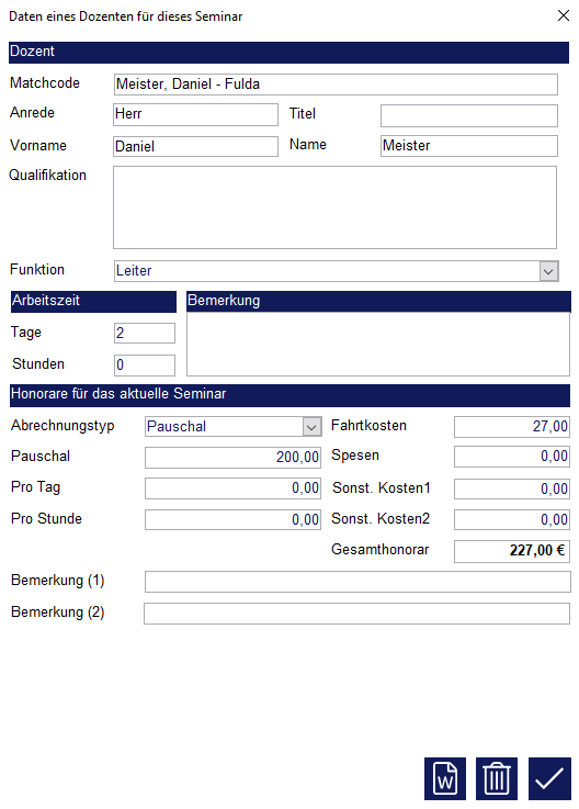 Ein Honorar wird in der Regel erst für das jeweilige Seminar eingegeben. Gibt es allerdings feste Sätze für einen Dozenten, kann im Stammdatensatz eine Vorgabe definiert werden.