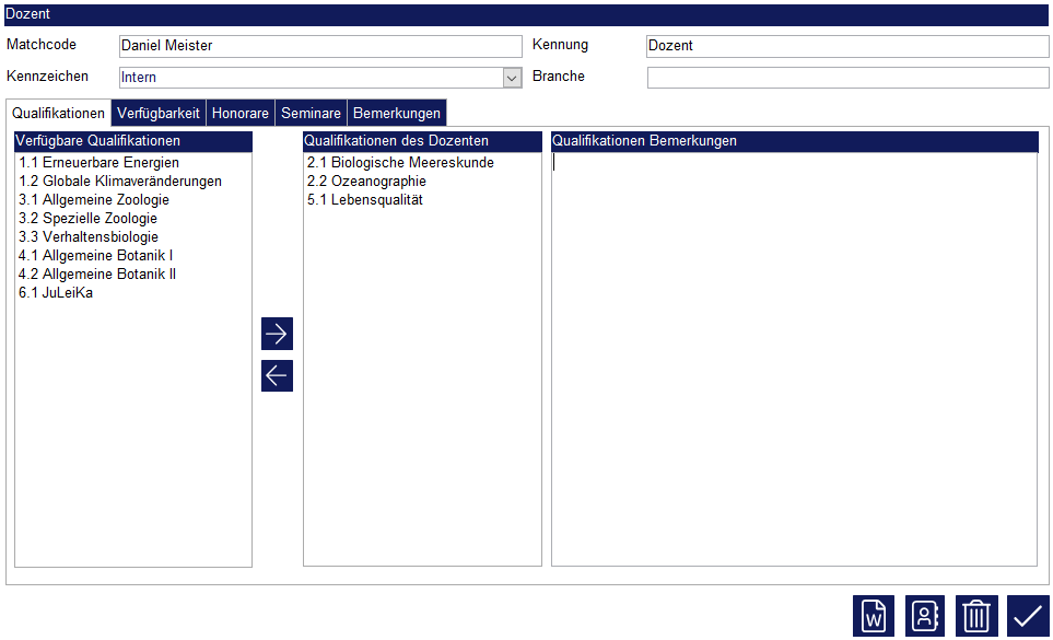 Neue Qualifikationen werden im Menü unter „Einstellungen“ > „SeminarManager“ > „Dozentenqualifikationen“ angelegt. Sie können einem Dozenten eine Qualifikation zuteilen, indem Sie die Qualifikation auf der Maske „Dozent“ (Karteireiter „Qualifikation“) mit einem Klick markieren und auf den Button mit dem Pfeil nach rechts klicken. Alle Qualifikationen, die einem Dozenten zugeteilt sind, stehen in dem Kasten „Qualifikationen des Dozenten“. Einem Dozenten können beliebig viele Qualifikationen zugeteilt werden.