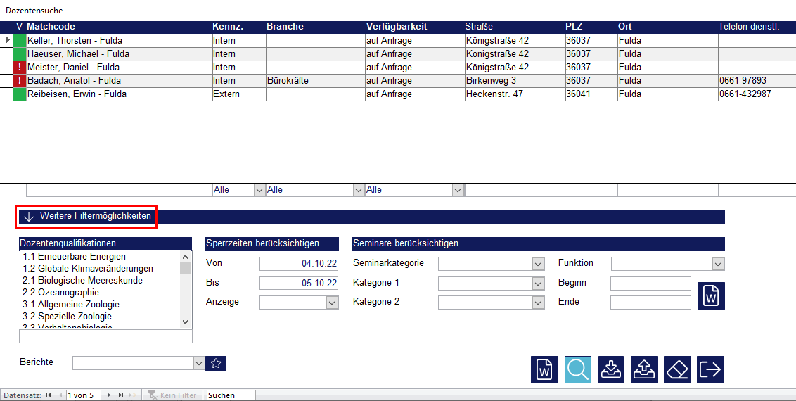 Am unteren, linken Bildschirmrand gibt es außerdem einen Schalter namens „Weitere Filtermöglichkeiten“. Mit einem Klick auf diesen Schalter klappen sich weitere Suchfelder auf. Sie haben hier die Möglichkeit, Dozenten nach Qualifikationen zu suchen, sowie Sperrzeiten und Seminare zu berücksichtigen.