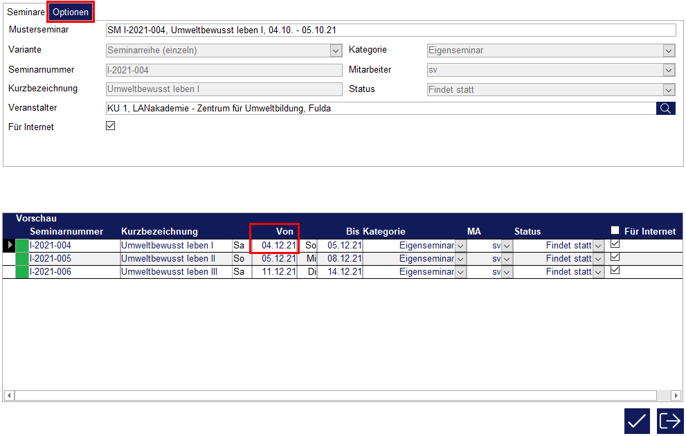 Die Einstellungen betreffen jedes Seminar der Reihe. Über den Schalter mit dem Haken-Symbol unten rechts werden die Seminare, sowie die Seminarreihe angelegt.