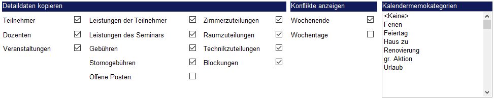 Unter „Optionen“ wird eingestellt, welche Detaildaten mitkopiert werden sollen. Wird das Seminar bspw. von den gleichen Referenten durchgeführt und in den gleichen Seminarräumen?