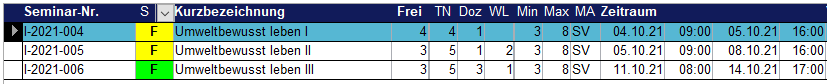 Die Suche wird mit einem Klick auf den Schalter mit dem Lupensymbol gestartet. Sie können zuvor in der unteren Zeile entsprechende Suchkriterien eingeben. Ein Doppelklick auf den Datensatzmarker (das schwarze Dreieck) zu Beginn einer Zeile wählt das Seminar aus und fügt es zu der Seminarreihe hinzu.
