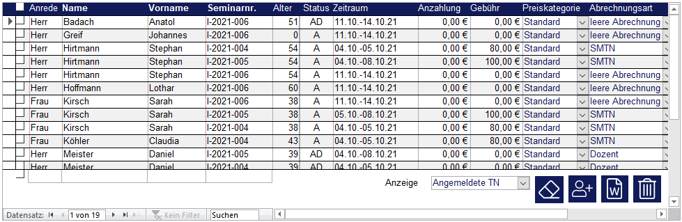 Diese Daten können/müssen je Seminar hinterlegt werden. Wenn ein Teilnehmer storniert, muss er aus jedem Termin der Reihe entfernt werden.