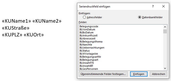Die Seriendruckfelder beginnen mit einer Abkürzung, welche die Zugehörigkeit kennzeichnet. „KU“ beispielsweise steht für Kundendaten, „BL“ für die Daten einer Belegung und „BT“ für Betreuerdaten.