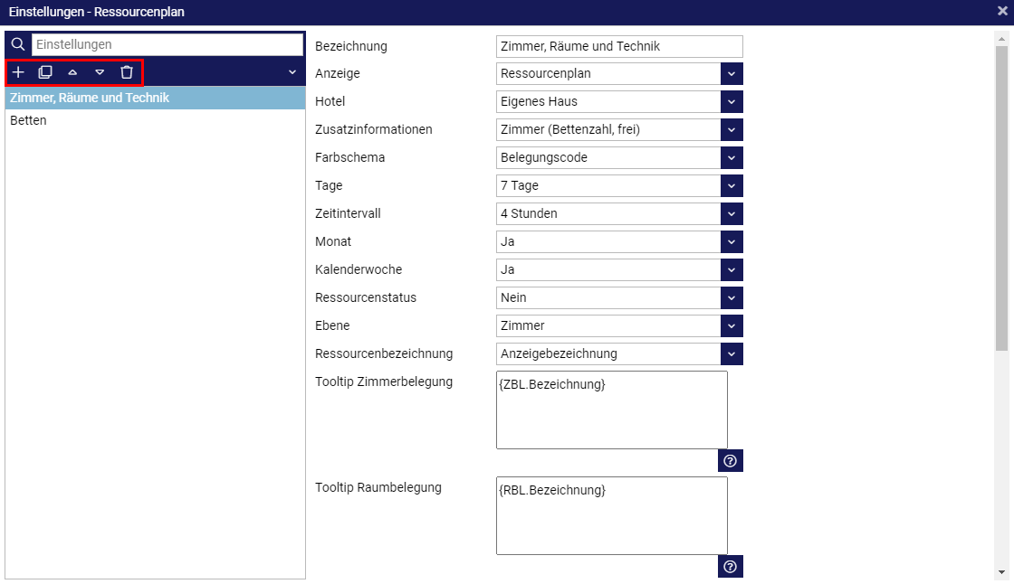 Es wird pro Ansicht eingestellt, welche Ressourcen in welcher Reihenfolge angezeigt werden sollen. So können Sie ganz individuell festlegen, weche Zimmer/Räume/Technik die einzelnen Pläne enthalten sollen.