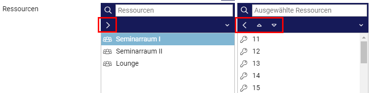 Mit einem Klick auf den Pfeil nach rechts wird eine markierte Ressource in den Bereich „ausgewählte Ressourcen“ übernommen. Verschieben Sie jede Ressource, die in die Ansicht übernommen werden soll.