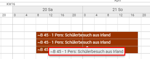 • Kundenkategorie: Jede Gruppe mit gleicher Kundenkategorie bekommt die gleiche Farbe. Z. B. bekommen alle Belegungen die Farbe Blau, bei denen der Kunde die Kategorie „Schule“ hat und alle Belegungen die Farbe Grün, bei denen der Kunde die Kategorie „Verein“ hat.