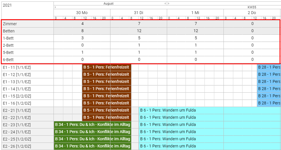 • Belegungsart: Jeder Gruppe mit gleicher Belegungsart bekommt die gleiche Farbe. Z. B. können alle Ferienfreizeiten grün dargestellt werden, alle Seminare orange usw.