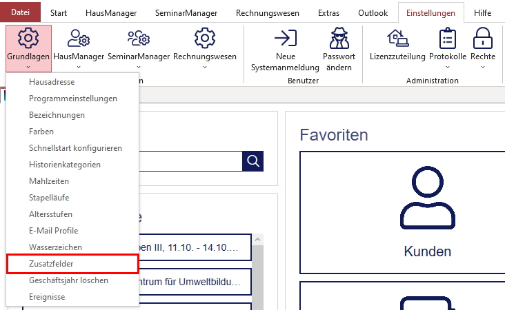 Um auf die Zusatzfelder in den jeweiligen Eingabemasken zuzugreifen, müssen diese zunächst im Programm hinterlegt werden. Öffnen Sie hierzu die Programmeinstellungen unter „Einstellungen“> „Grundlagen“> „Zusatzfelder“.