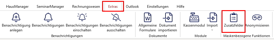 Zum Anzeigen der Zusatzfelder gehen Sie wie folgt vor: Haben Sie beispielsweise in den Einstellungen ein Zusatzfeld für Belegungen angelegt, können Sie dies im HausManager aufrufen, indem Sie zunächst über die Schaltfläche „Kunden“> „Belegungen“ nach einer bestimmten Belegung suchen und diese per Doppelklick öffnen. Nun klicken Sie auf den Karteireiter „Extras“ und auf die Schaltfläche „Zusatzfelder“ (siehe Bild).