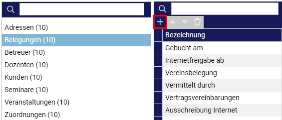Im sich daraufhin öffnenden Fenster sehen Sie auf der linken Seite die Bereiche, unter denen sich die Zusatzfelder anlegen lassen. Möchten Sie nun beispielsweise zusätzliche Informationen für Belegungen anlegen, klicken Sie zunächst auf „Belegungen“, sodass dieser Punkt markiert wird. Nun lassen sich im rechten Teil des Fensters die Zusatzfelder hinzufügen. Klicken Sie hierzu auf die Plus-Schaltfläche (siehe Bild). Weiterhin lassen sich auch bereits angelegte Zusatzfelder über die darüber liegende Suchfunktion finden.