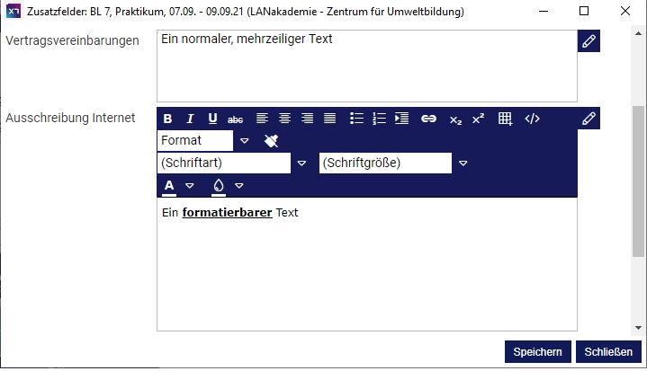 In dem sich öffnenden Fenster werden Ihnen nun die Zusatzfelder angezeigt, die Sie für die entsprechende Kategorie definiert haben. An dieser Stelle können Sie die für die Belegung bestimmten Informationen eingeben. Im folgenden Beispiel sehen Sie zwei Zusatzfelder (Text mehrzeilig und Text frei formatierbar), die für Belegungen angelegt wurden.