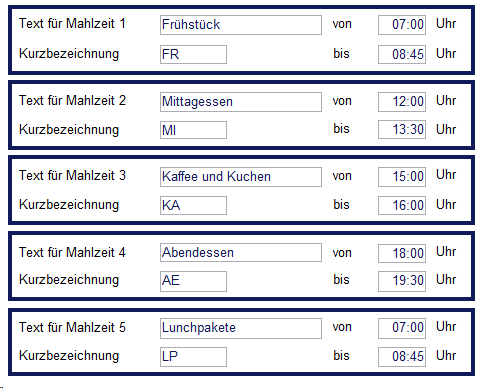 In den folgenden Einstellungen „Uhrzeit der x. Mahlzeit (Anfang / Ende)“ geben Sie den Zeitraum ein, in dem die Mahlzeit angeboten wird. Diese Einstellung ist wichtig für die An- und Abreise von Gruppen und Teilnehmern. Der HausManager erkennt anhand der An- und Abreisezeit automatisch, welches die erste bzw. letzte Mahlzeit einer Person/Gruppe ist.