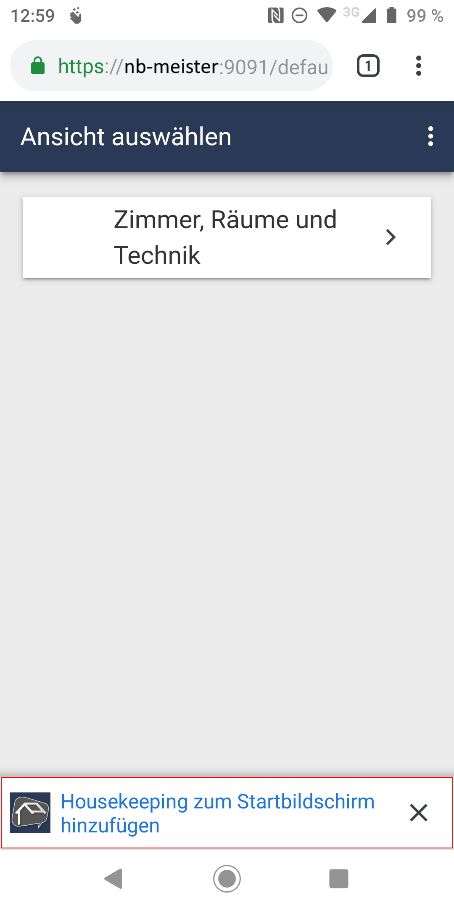 Bitte beachten Sie, dass ein Zugriff über Geräte, auf welchen der HausManager NICHT installiert ist, nur bei vorheriger Installation eines Sicherheitszertifikats möglich ist. Dies gilt sowohl für Smartphones und Tablets, als auch für PCs und Laptops. Das benötigte Zertifikat befindet sich im Installationsverzeichnis des Anwendungsservers und muss auf dem jeweiligen Endgerät installiert werden. Bitte kontaktieren Sie hierzu Ihre EDV-Betreuung. Ohne Installation des Zertifikats ist der Zugriff auf die Clean & Repair-App nicht möglich.
