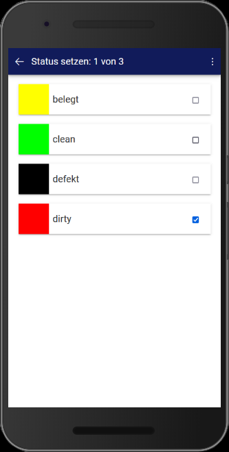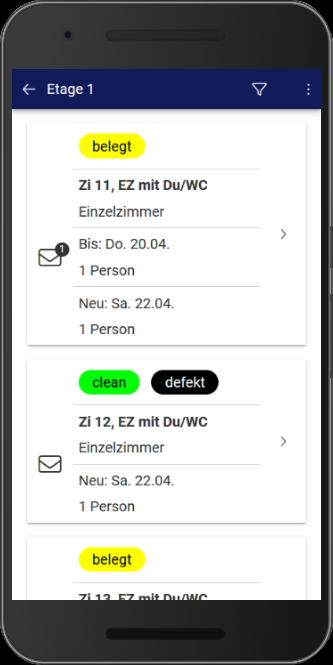 Mithilfe der Clean & Repair-App können Sie ihr Reinigungspersonal bequem über die zu reinigenden Zimmer und Räume ihrer Einrichtung informieren. Das Reinigungspersonal wiederum kann den Status eines gereinigten Zimmers mithilfe der App auf z. B. „Sauber“ setzen. Der geänderte Status wird anschließend in den Ressourcenplan übertragen, sodass Sie immer über den aktuellen Stand ihrer Zimmer informiert sind.