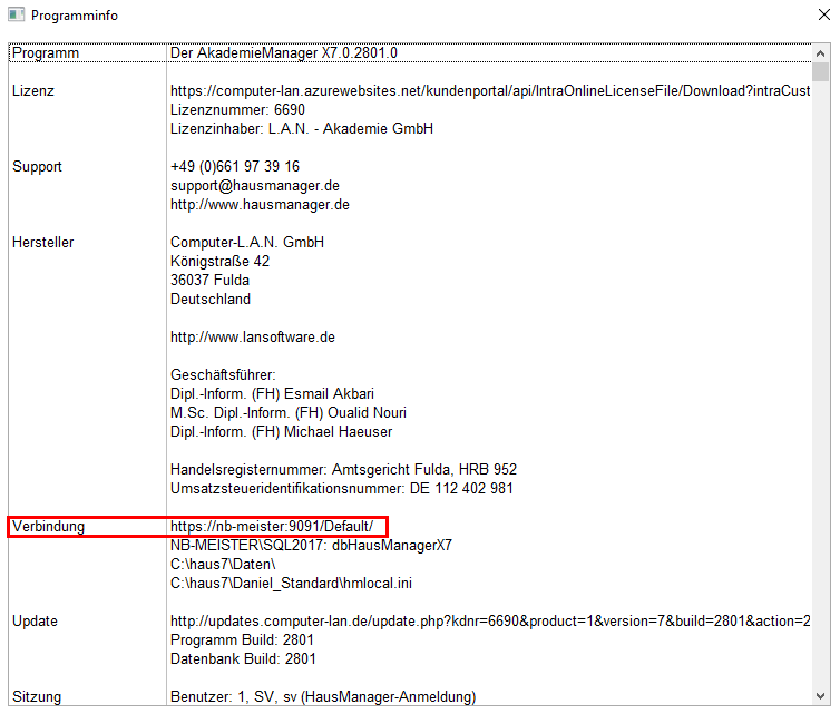 Notieren Sie sich die Adresse, welche in der obersten Zeile des Bereichs „Verbindung“ angezeigt wird. Sie lautet in diesem Beispiel https://nb-meister:9091/Default/. Hängen Sie an diese Adresse nun zusätzlich folgendes an: „HouseKeeping/“. Die vollständige Adresse lautet nun https://nb-meister:9091/Default/HouseKeeping/.