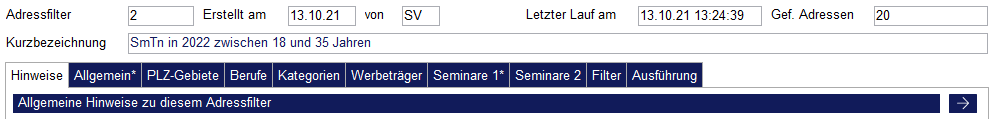 - Ein Eintrag „98*“ bringt alle Adressen, die bei Seminaren eingetragen sind, deren Seminar-Nummer mit 98 beginnt, alles was nach der 98 kommt jedoch egal ist.