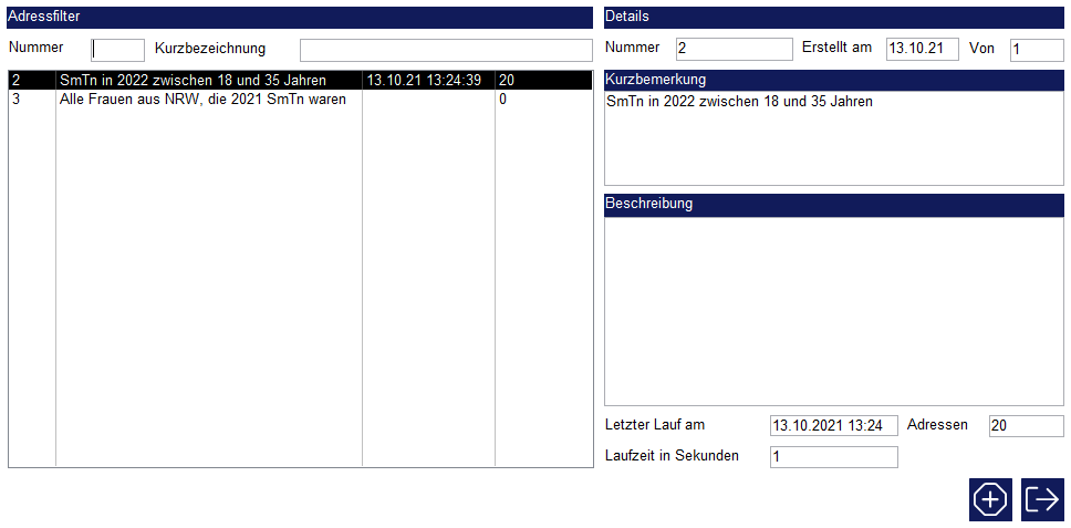 Über den großen Schalter „Ausführung & Übergabe an Selektion” können Sie die Ausführung starten. Der Rechner wird dann u. U. eine geraume Zeit sehr stark beschäftigt sein. Die Dauer hängt hier natürlich entscheidend von der Gesamtzahl der vorhandenen Adressen, der Komplexität des ADFs und der Geschwindigkeit des Netzwerkes ab. Wenn sich Ihr Rechner also eine längere Zeit nicht mehr meldet, machen Sie bitte keinen “Warmstart”, Reset oder schalten Sie ihn auf keinen Fall aus. Notfalls sollten Sie einen Filterlauf einfach vor der Mittagspause oder dem Feierabend starten. Sie bekommen aber nach kurzer Zeit heraus, wie lange einzelne Läufe ungefähr dauern werden und können sich darauf einstellen.